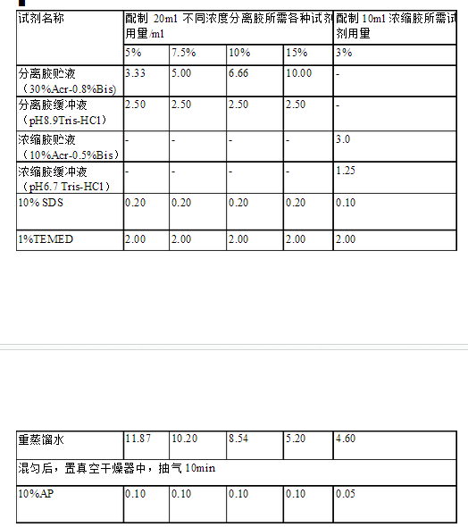 ?2.配膠:根據(jù)所測蛋白質(zhì)分子量范圍,選擇適宜的分離膠濃度。本實(shí)驗(yàn)采用SDS-PAGE不連續(xù)系統(tǒng),按下表的配制分離膠和濃縮膠。 ?