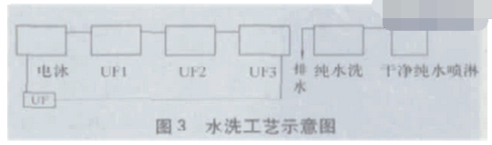 從圖2可以看到,磷化后到電泳前的水洗工藝,各槽均有連通管,應采用逆向補水的方式,提高水的利用率。干凈純水噴淋工件后,清洗水回到純水洗槽,純水洗槽水溢流到前面自來水洗槽,然后再溢流到前面自來水噴淋水槽,通過噴淋水槽排放,實現水的重復利用。通過檢測各槽水的pH值、電導率等控制清洗水的排放和更換。日常生產管理中,在需要全部更換純水洗槽時,可以用純水洗槽的水置換自來水洗槽,或者在更換自來水洗槽時,用純水槽里的水沖洗自來水槽。