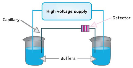 毛細管電泳是一種使用非常狹窄的毛細管的技術,通常將內徑為50 µm,外徑為300 µm,以分離各種各樣的大小分子。圖1是CE系統的示意圖。它包括電源,毛細管,緩沖液儲存器和檢測器。