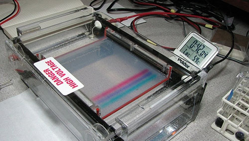 該罐通過緩沖溶液,再通過瓊脂糖凝膠產(chǎn)生電流(范圍為50至150 V)。瓊脂糖凝膠的孔位于電流的負(fù)極(陰極),凝膠的另一端位于電流的正極(陽極)。