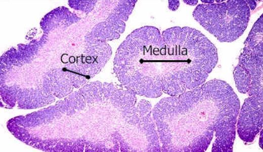 胸腺是 T 細(xì)胞發(fā)育和成熟的場所。它是一個扁平的雙葉器官,位于心臟上方。胸腺外部覆蓋有一層囊層,內(nèi)部分為小葉,小葉通過稱為“小梁”的結(jié)締組織相互連接。每個小葉分為兩個隔室。外室或皮層密集地擠滿了稱為胸腺細(xì)胞的未成熟 T 細(xì)胞,內(nèi)室或髓質(zhì)與皮層中的胸腺細(xì)胞網(wǎng)絡(luò)相連。